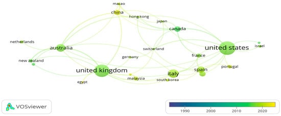 In the context of examining co-authorship patterns within specific countries through overlay visualization, certain noteworthy trends and dynamics emerged. Authors from the United States demonstrate a robust pattern of collaboration between the years 2014 and 2018. This suggests that during these years, researchers from the United States engaged in extensive cooperation, resulting in a substantial number of co-authored papers. After 2020, Chinese authors have shown a strong collaborative presence and have taken the lead in terms of co-authorship connections. This indicates that Chinese authors are actively participating in contemporary publishing trends, with their collaborative efforts becoming increasingly prominent after 2020 (Figure 7).