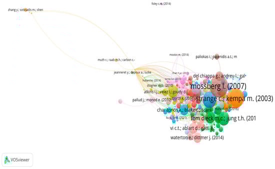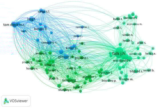In the network visualization of co-citations of cited authors (Figure 9), there are three clusters. In this intellectual structure of co-citation of authors, a total of 25,012 link strengths and 3265 links are counted. The first cluster (red-colored) contained 42 authors co-cited together; in the second cluster (green-colored), 38 authors co-cited together; and in the third cluster (blue-colored), 19 authors co-cited together in the co-citation of their works. Co-citation analysis considers documents that are cited together in the reference lists of other documents, even if they do not directly reference each other. For instance, the works of [93,94,95] and [8] are co-cited, but they are not listed in this compilation of articles. This is because the works of Hooper-Greenhill, Hein, and Falk are books, editorial notes, and book chapters.