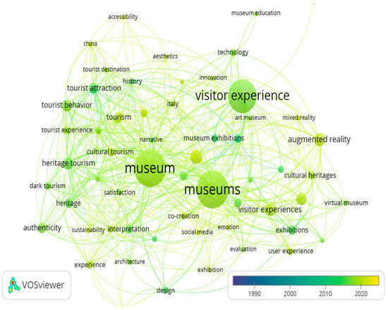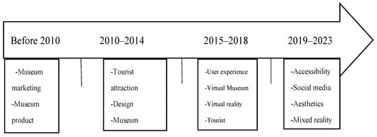 A decade ago, subjects such as museum management, museum exhibitions, and tourist attractions co-occurred as keywords reflecting the research landscape at that time. (Figure 12). Figure 12 shows the emergence of keywords as a new research area. Before 2010, key terms like museum marketing, museum product, and public participation are very common in museum visitor experience studies. Between 2010 and 2014, the key terms of a museum as a tourist attraction, design in the museum, museum exhibition, and digitalization of heritage occurred. From 2015 to 2018, keywords like user experiences in museums, virtual museums, virtual reality, authenticity, co-creation, and tourist behavior in museums were very common. Recently, after 2019, the issues of accessibility, social media, aesthetics, mixed reality, sustainability, emotion, and innovation in museum visitor experience studies have emerged. As such, future researchers in the field of museum visitor experience need to consider these emerging key terms identified through co-occurrence analysis. The new definition of a museum developed by the International Council of Museums [125] also aligns with these emerging themes, emphasizing openness, accessibility, diversity, and sustainability. This reflects a shift towards more inclusive and community-oriented museum practices, with a focus on offering varied experiences for education, enjoyment, reflection, and knowledge sharing.