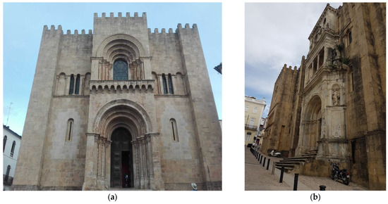 The Old Cathedral (Sé Velha) of Coimbra (Figure 1a), one of Portugal’s most outstanding examples of Romanesque architecture, was chosen for this case study. Built in the 12th century, this cathedral exhibits characteristics typical of the period, including robust stone construction, arched entryways, and ornate sculptures [28]. In the second half of the 12th century, the original Old Cathedral of Coimbra was rebuilt in place of another church. Construction of the current structure began in 1160, during the episcopate of Bishop Miguel Salomão [9,16]. This church was labelled a Romanesque building by Master Roberto, a French architect [9].