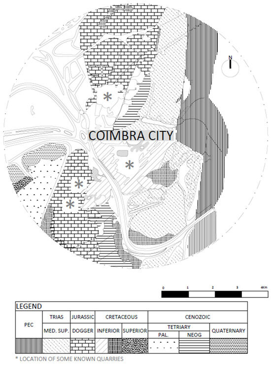 Coimbra is located over an area of transition between Precambrian phyllites in the east and the Meso–Cenozoic west border composed of sandstone and limestone units [16]. The correspondence between the geological time and the type of carbonate stones in Coimbra and its surroundings was also recorded [16], as follows: