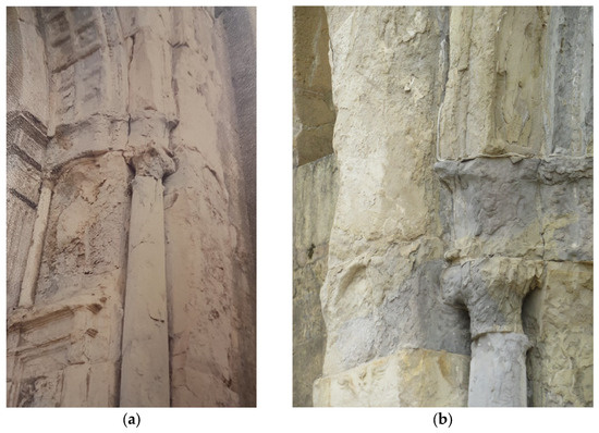 Details of different carbonate rock types and decay in the Porta Especiosa portal (a) credits: [15]; (b) credits: Alice Tavares.