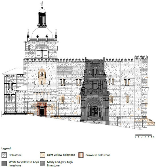 Previous studies indicated the presence of different types of carbonate rocks such as dolostone, calcitic dolostone, and Pedra de Ançã limestone (white to yellowish and marly to grey) at the Porta Especiosa portal, although this position did not achieve consensus and appears to depend upon the sampling location. Most of the results obtained from other sampling areas considered the use of dolostone, with the main body showing a dark patina that hides the yellowish colour of the dolostone used in the frames of windows.