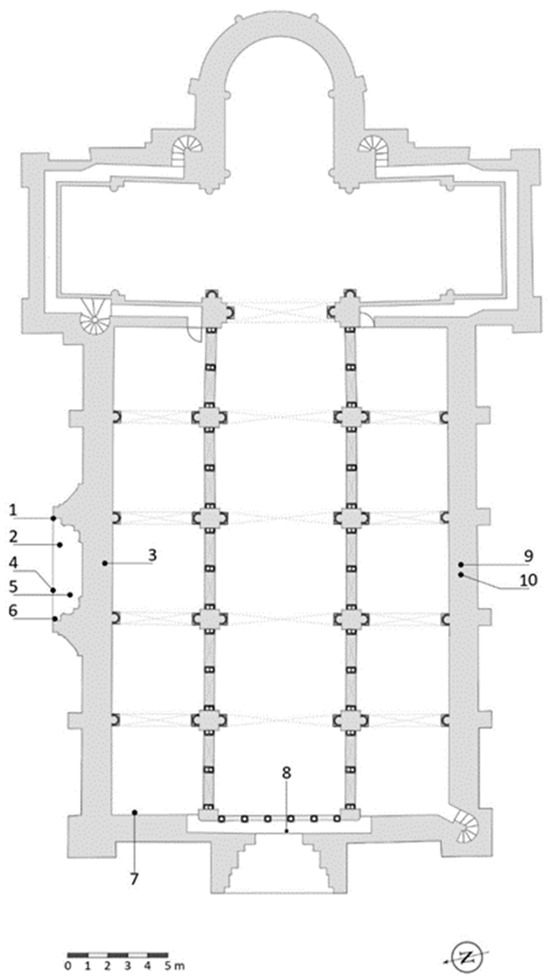 The following plan for the first floor of the cathedral identifies the sample collection locations. Table 5 presents the identification of the samples.