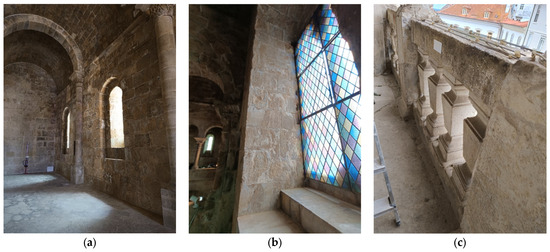 The Sé Velha Cathedral of Coimbra, including the Porta Especiosa, has been subject to restoration interventions since the 19th century along with successive attempts to maintain and reverse the severe degradation of the stone [9]. The detected pathologies are mainly related to the construction itself, the variety of carbonate rocks used, and the lithological characteristics leading to structural disintegration [10,12,13,14,16,27,28]. For this reason, a considerable portion of the Porta Especiosa was irretrievably lost; damage to the stone of the facade walls and internal vaults is also visible. This situation has led researchers to question the type of stone used and whether its characteristics make it suitable as a construction material.