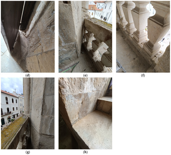 (a) Samples collected from windowsills (PEt; P3P); (b) sample collected from the windowsill of the front façade (PPch); (c) sample collected from the balcony guard (PEC); (d) sample collected the wall at the entrance (PES); (e) sample collected from the wall near the floor and colonnade (PE1, PER); (f) sample collected from the base guardrail (PEch); (g) sample collected from the sill guard (PEE); (h) sample collected from the base of the wall (PPch). Credit: Alice Tavares.