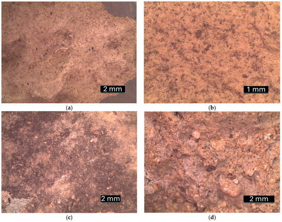 Observations were conducted using a Zeiss Jenapshot 2000 Optical Microscope (Jena, Germany) to investigate the surfaces of the samples. Additionally, a Konica Minolta Sensing Chroma Meter CR-400 (Ramsey, NJ, USA) colorimeter was used to analyse the colour properties of the stones. The colour analysis was based on the CIELAB colour space, utilizing the parameters a*, b*, and L*. For each sample, three measurements were performed using both sides of the samples.