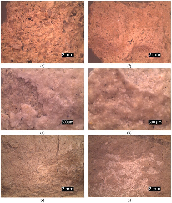 Ançã limestone is heterogeneous in its colour and composition, with the white-to-yellowish limestone commonly used for cornerstones and sculptures. Macroscopically, two groups can be distinguished: white-to-yellow limestone and marly and grey limestone [16]. The white-to-yellow limestone has a compact appearance, sometimes with a chalky quality. Researchers identified some marly limestone in the Porta Especiosa [16]. However, this discovery was surprising since this limestone is a poor construction material due to its fine grains and light-to-dark grey colouration. The authors emphasized that when compared to the white limestone, the marly limestone presented a larger amount of Al2O3 and Fe2O3 and a smaller amount of CaO due to the presence of clay minerals [16]. The high Fe2O3 content is due to the impregnation of clay minerals with colloidal iron such as Fe(OH)3 [16]. On the other hand, there is a significant amount of Fe2O3 in the dolostone. Consequently, weathering of these rocks typically results in colour changes due to iron oxidation [16].