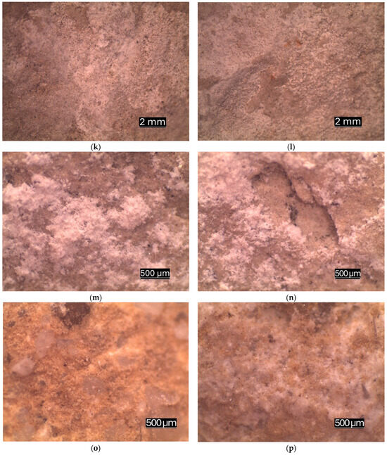 The PEt and P3P samples, on the other hand, were still carbonated but presented a different chemical–mineralogical composition compared with that of Ançã, Portunhos, and Outil limestone. With the significant presence of quartz and feldspars (both silicates), the calcite content decreased, whereas the Si, Al, K, and Fe contents increased. These features indicate marlstones, which are softer and chemically more vulnerable than the other three types of limestone previously described. These two samples were located (Figure 5) in a different part of the building, relatively far from the famous Porta Especiosa on one of its more monumental components, close to all other samples. These stones likely represent a “second-class” choice or a posterior replacement using stones of lesser quality.