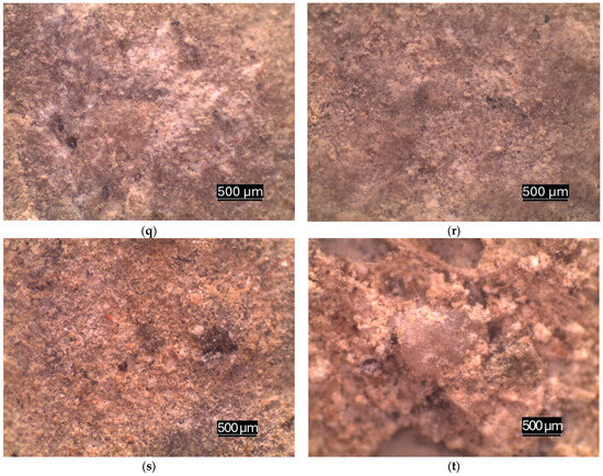 Visual analysis of the topography of the samples: (a) PEE—top face; (b) PEE—bottom face; (c) PEt—top face; (d) PEt—bottom face; (e) PPch—top face; (f) PPch—bottom face; (g) PEch—top face; (h) PEch—bottom face; (i) PEC—top face; (j) PEC—bottom face; (k) PER—top face; (l) PER—bottom face; (m) PES—top face; (n) PES—bottom face; (o) PLE—top face; (p) PLE—bottom face; (q) PE1—top face; (r) PE1—bottom face; (s) P3P—top face; (t) P3P—bottom face.