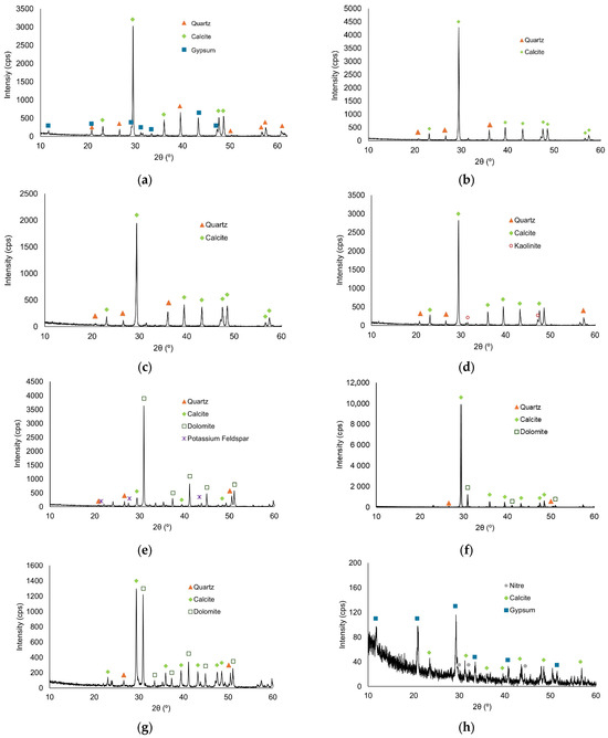 The mineralogical analysis (Table 7 and Figure 8) yielded the typical composition of regional calcitic limestone (i.e., samples PER, PEE, and PEC) and dolomitic limestone (PE1 and PLE); however, one sample was more similar to a dolostone (sample PPch). As expected, the sampled efflorescence indicated the presence of sulphates such as gypsum (Ca sulphate), coquimbite (Fe and Al sulphate), and rozenite (Fe sulphate); nitrates such as nitre (K nitrate); and secondary carbonates such as vaterite (Ca carbonate) and huntite (Fe and Mg carbonate).