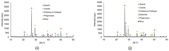 The results obtained from the X-ray diffraction (XRD) analysis are summarized in Table 7 and Figure 8. These results provide information regarding the peaks associated with the mineralogical phases present in each sample, enabling categorization based on their specific characteristics.