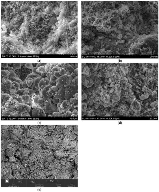SEM images from the samples: (a) P3P; (b) PE1; (c) Pech; (d) PEE; (e) PPch.