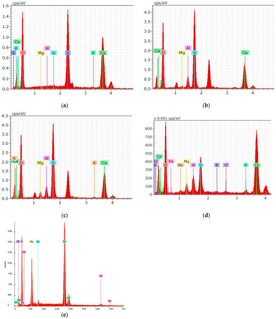 Figure 9 and Figure 10 present the results obtained from the SEM/EDS analyses of the most representative samples of the different stones.