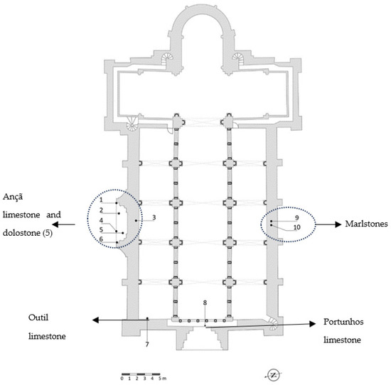 These results reveal the use of different types of carbonate stones in different parts of of the Sé Velha Cathedral, as presented in Figure 11.