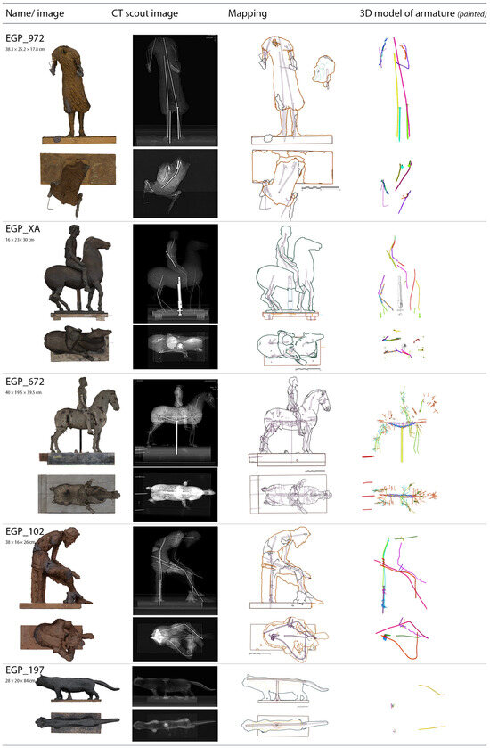 The five selected figurines (photogrammetry-generated 3D models) along with their scout files (CT scan), mapping, and 3D reconstruction models of the armature.