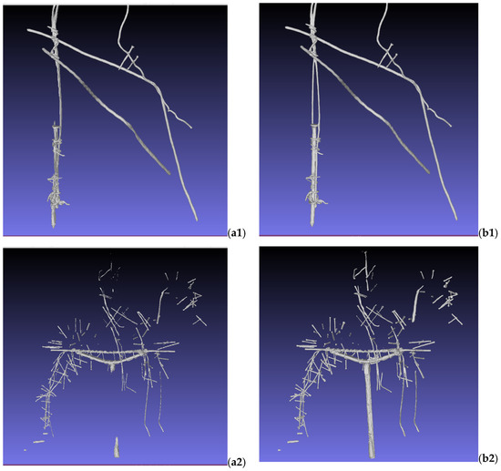 The post-processing of the extracted 3D models was performed in MeshLab [78] and included the mesh cleaning and surface refinement of the model. Cleaning involved the removal of unnecessary elements, isolated pieces (diameter 5%), unreferenced vertices and T-vertices, and the repair of non-manifold edges. The modeling process created tunnels, which were identified and repaired by selecting and removing vertices, filling the area (cap hole) and removing residue isolated pieces.