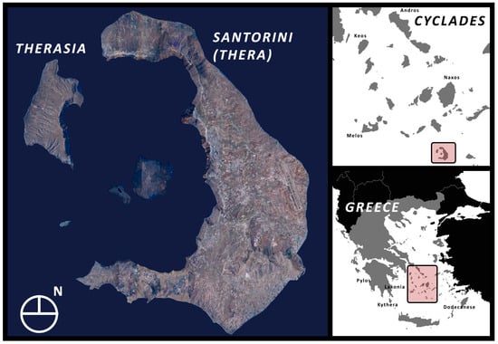 - Vougioukalakis, G.; Farinetti, E.; Christopoulou, M. Γεωλογική Δομή Και Εξέλιξη Της Θηρασίας: η Παλαιοτοπογραφία Της Νήσου Πριν Τη Μινωική Έκρηξη Subtitled [Geological Formation and Evolution of Therasia: The Palaeotopography of the Island before the Minoan Eruption]. In Θηρασία ΙΙΙ: Aρχαιολογική Έρευνα και Ιστορία του τόπου μιας νησιωτικής κοινωνίας Subtitled [Therasia III: Archaeological Research and Landscape History of an Island Community]; Sbonias, K., Tzachili, I., Eds.; Τα Πραγμάτα: Athens, Greece, 2021; pp. 28–55. [Google Scholar]