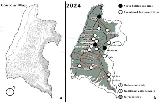 (a) A topographic map of Therasia, exhibiting graduated contouring. (b) This map of Therasia depicts the active, modern settlement sites, as well as the abandoned sites that were the focus of this research project. Additionally, the terraced area of the island is illustrated, as well as the traditional path and modern road network.
