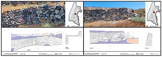 At an architectural scale, one hundred dry-stone walls were selected to study their features. Each wall was measured, drawn, and its unique relation with the surrounding vegetation and biodiversity was documented (Figure 3). The selection process was based on the following criteria: (a) the dry-stone walls must have architectural or structural significance, (b) they must be in good condition, and (c) they should be located across the entire island. Additionally, special attention was given to (d) the dry-stone walls along the paths and (e) those in the abandoned micro-settlements.