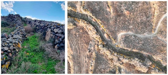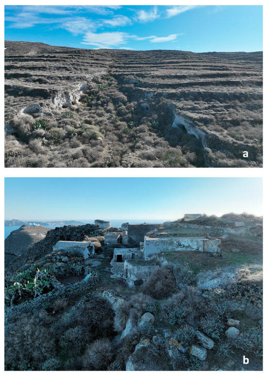 Therasia, as a closed system, has preserved a large part of the natural and cultural landscape, resulting in features that make its study particularly interesting. A survey between 2013 and 2014 has indicated the existence of more than 80 rupestrian compounds, each of which could contain from a few to a dozen cave buildings, with the village of Agrilia, an abandoned rupestrian village spread over two ravines, being the most prominent [,]. In addition, a direct link between the layout of the settlements and the intra-site cultivations (gardens, cisterns, etc.) with unique characteristics (architectural, structural, and social), creates a rare rural built environment [].