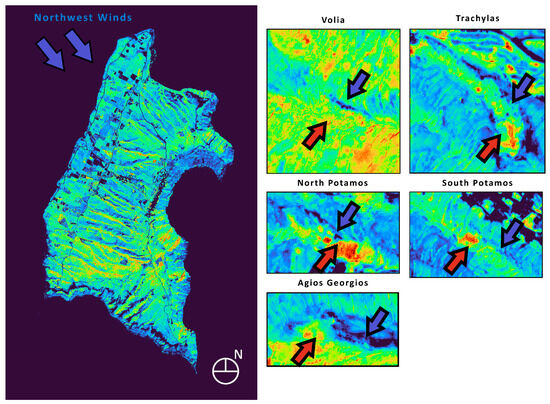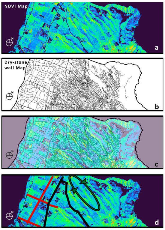 Rural architecture impacts the vegetation of the island in more than one way. The dry-stone walls of the terraces and paths organize, demarcate, and enhance the flora. This is most evident in the paths where the different colors on either side of the wall indicate that the density of the vegetation is affected, even on a small scale, in a field or terrace. This is even more pronounced in the paths with an east–west direction. In all cases, it can be observed that the warmer color is always to the north, probably due to environmental factors, such as the strong north and northwest winds (Figure 11d).
