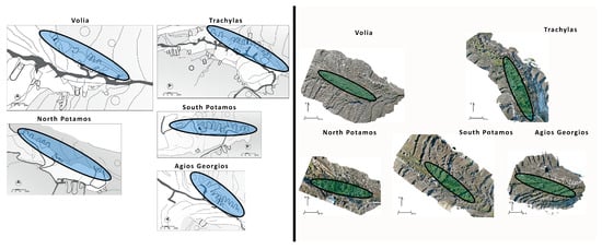 Over the past two decades, the study of abandoned settlements has emerged as a key area of research to gain a deeper understanding of the transformation of Greek agrarian societies. The advent of new technologies and tools has brought the landscape to the fore in this field of study. Software programs, such as Geographic Information Systems (G.I.S.s) facilitate the organization of spatial data [], while others like Agisoft’s Photoscan/Metashape enable the rapid documentation of land and buildings in great detail []. Remote sensing techniques offer valuable tools that can provide interpretations that are otherwise impossible [].