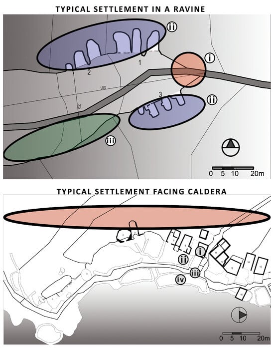 The typical settlement in a ravine exhibits the following characteristics: (i) the settlement is situated in a narrow portion of the ravine, (ii) the Residential Complexes located on the northern cliff exhibit a 2.5:1 ratio in comparison to the southern cliff, and (iii) the gardens are typically positioned in the southern part of the ravine. Typical settlement facing caldera: the top of the caldera (red color) serves to protect the houses from the strong northwestern winds. The typical arrangement from west to east is as follows: (i) house, (ii) courtyard, (iii) road, and (iv) garden.