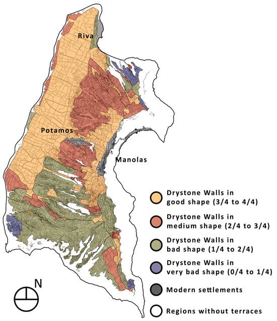 The island was scanned using a variety of remote sensing tools, including high-resolution satellite photographs, aerial photographs from UAVs, and traditional surveying methods (in situ photographs, sketches, and notes). Every dry-stone wall on the island was recorded and documented, excluding those present in the three modern villages (Manolas, Potamos, and Riva) and the semi-abandoned village of Agrilia, which had been previously thoroughly studied [,,]. The rate of deterioration of the Therasian dry-stone walls was ascertained through the analysis of data and photographs collected from the THALES project (conducted over a decade ago), along with aerial photographs provided by the Hellenic Military Geographical Service from the 1940s, 1960s, and 1980s, and interviews with elder locals. A map was developed to illustrate the current state of the dry-stone walls on the island. This is discussed in further detail in the Results section below. Dry-stone wall condition was recorded on a four-point scale: (i) walls in good condition; (ii) walls that had collapsed in places; (iii) walls where over half of the walling had been collapsed; and (iv) walls with almost nothing standing.