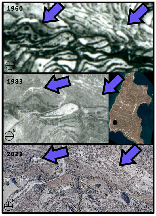 The oldest available high-resolution aerial photographs are from 1975 and 1983. By monitoring the evolution of the fields and identifying those that were abandoned between these dates, it is possible to ascertain the approximate time of abandonment. A comparison of the walls in 1975 and 1983 with those recorded in this study (2022) allows for the relative calculation of the wall degradation extent (Figure 12). In the southern part of Therasia, where rural architecture is in a particularly deteriorated state, observations indicate that over approximately 40–50 years, the walls have deteriorated by one rank according to the dry-stone wall condition map (Figure 9). Archival research conducted in the Municipality of Therasia lends further support to the aforementioned hypothesis. A list of each field and its owner from the cultivated areas in the 1950s indicates that the majority of the southern Therasia region had already been abandoned. A more comprehensive understanding of the island’s evolution could be gained through an examination of the approximately 45-year span of abandonment.