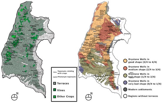 Toponyms related to crops, fields, and plants are displayed in Greek, on both a cultivation map (on the left) and a map indicating the condition of dry-stone walls and terraces (on the right).