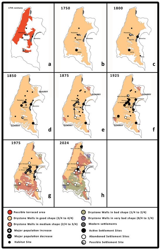 In the initial decades of the 19th century, a number of settlements were established, including Potamos, Agrilia, and Kera (Figure 14d). It seems probable that additional, smaller habitation sites were also developed. This proliferation of settlements and habitation sites was accompanied by demographic growth due to the Treaty of Küçük Kaynarca (1774) and the Greek War of Independence (1821–1832). The conversion of seasonal to year-round settlement sites is closely related to the rise of viticulture, which requires more time in the fields than cereal farming [].