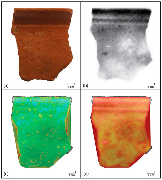A rim and shoulder potsherd from a guan jar recovered during the excavation of the Longshan site of Huizui, China (third millennium BC). (a) displays a photograph of the sample and (b) the histogram-stretched, “equalised” radiograph. Subsequent manipulation through regional manipulation algorithms revealed that the “Beta fractal” image seen in (c) isolates the concentrations of inclusions pushed upwards in the vessel wall through paddling action, shown in blue, and the “entropy” filter image seen in (d) is productive for distinguishing paddle-and-anvil formation and delineating paddle impact zones. Reprinted with permission from Ref. [6]. 2017, Elsevier.