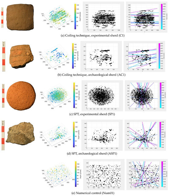 Experimental archaeology provides a way in which interpretations of features within CXT images of ceramics to imply particular fabrication routes can be validated. This is because the different modes of forming a vessel each leave their own distinctive signature in the item [14,15]. During the fabrication of a vessel, the shaping and squeezing of the clay leads to the formation of a large number of pores. The orientation of these pores can inform on the technique that the potter was using. For example, Lindahl and Pikirayi [14] simulated the fabrication of clay vessels using four different forming methods, namely the U- and N-techniques of coiling and two types of modelling techniques. The first modelling technique is simply to shape a vessel by pressing the walls out of a lump of clay with the fingers. The second modelling technique involves initially pulling a thick coil of clay, using the fingers of one hand on the inside of the vessel with the other hand acting as a support on the outside. Lindahl and Pikirayi [14] found that there was a clear difference in the disposition of the pores depending upon whether a coiling or modelling technique was used. A clear difference was also observed between the U- and N-techniques of coiling. While both coiling methods give rise to clearly visible coils and pores orientated from one wall surface to the other, the U-technique gives a distinct curving of the pores, while the N-technique leads to a diagonal orientation. In contrast, it is more difficult to distinguish between the two aforementioned modelling techniques using two-dimensional sections. However, these findings from experimental archaeology have been used to aid in distinguishing the forming technique used between Early and Late Iron Age pottery from southern Africa [14]. In particular, pottery sherds from the former showed a clear coiling technique, while the latter had a pore structure parallel to the vessel walls, thereby implying a modelling technique was used.