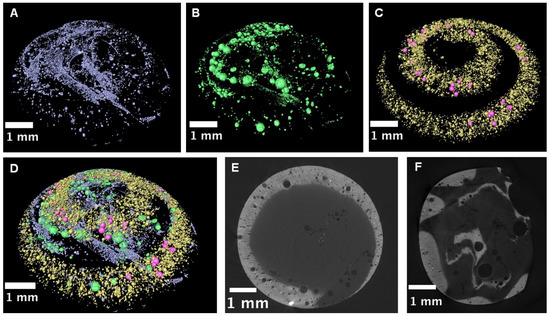 Bubble distribution in Class 13, spiral decorated beads. (A–E). Museum record: ABDUA:15543; (F). Museum record: ABDUA:15514. (A). Seeds and small bubbles (Ø < 100 μm) in the translucent glass of the top section. (B). Bigger bubbles (Ø > 100 μm) in the translucent glass. Note the cluster of large air traps (Ø < 500 μm) on the left-hand side, developed in the glass of the body at the border with the decoration. (C). Small (yellow) and big (pink) bubbles in the leaded glass. (D). Reconstruction of all the bubbles of all sizes in the top section. (E,F). Internal cross-section of the two beads under investigation, showing an inter-layer of seeds between cores of contaminated waste glass and coating layers. Reprinted with permission from Ref. [4]. 2014, Elsevier.