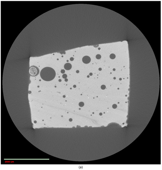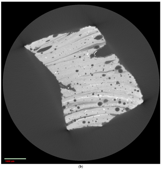 Typical 2D cross-sections taken from 3D CXT images of BRAK14 (a) and BRAK17 (b) Bronze Age glass samples from Syria. The scale bars indicate 1000 or 2500 μm. Reprinted with permission from Ref. [35]. 2020, Elsevier.