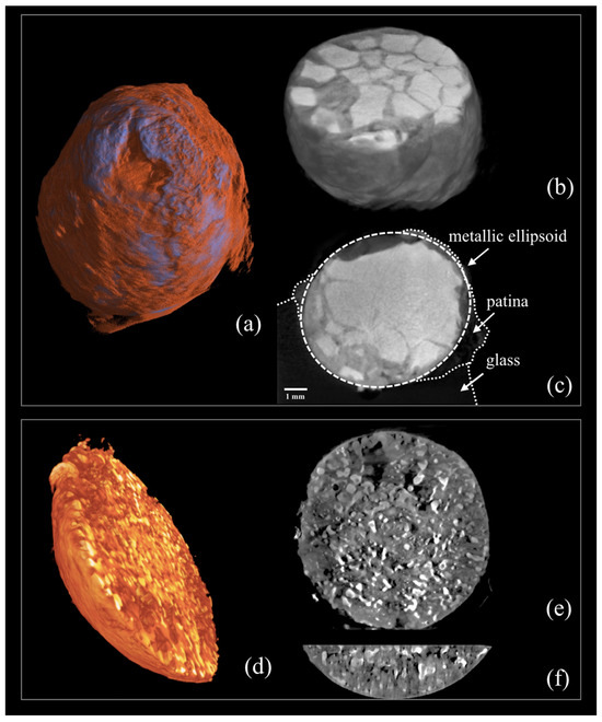 Franceschin et al. [38] used synchrotron CXT with phase contrast and a resolution of ~1–2 μm to study the multi-layer patina preserved within a groove in ancient (~1st c. BCE to 1st c. CE) glass from Aquileia, Italy. CXT could provide full 3D reconstructions of the layered structure of the patina, which is not possible with 2D sectioning. The CXT data suggested that the temporal progression of the glass alteration had three main stages, namely: (1) formation of a hydrated layer, (2) re-organisation of the aggregated silica nanoparticles in laminated layers, and (3) patina homogenisation and ageing.