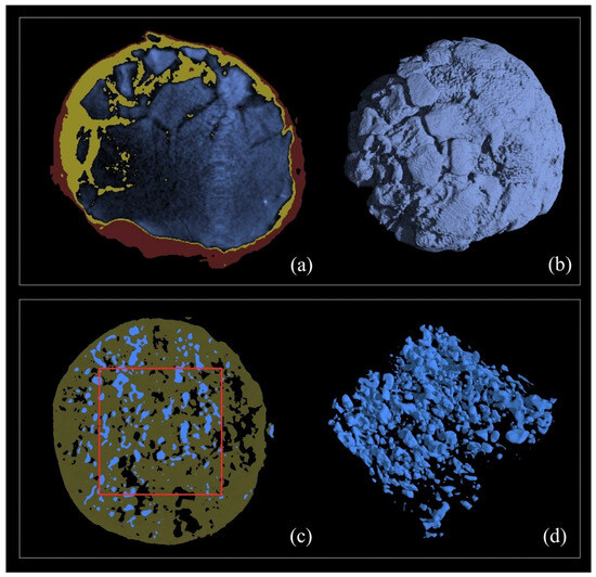 Besides just characterising a fixed void space structure, CXT can also be used to study either evolving pore structures, which are changing over time, or dynamic processes that occur within the void space over real time. CXT can be used to follow dynamic processes, such as the ingress of fluids into porous systems if the image acquisition time is sufficiently short compared with the characteristic time of the physical process being monitored. For example, CXT can be used to follow the relatively slow evolution in the pore structures of natural samples of building stones [48] or even following accelerated laboratory-based treatments used to mimic the longer-term, natural exposure to atmospheric acidic pollutants [49,50]. The CXT data can provide valuable information on the modifications to the pore structure induced via chemical attack, such as the formation of interior voids, otherwise hidden via the creation of exterior crusts [49]. CXT can also be used to follow the development of cracks, the locations of crystallisation out of salts, and the particular migration paths of permeating liquids [51]. The detailed surface renderings of objects provided by the full 3D reconstruction from CXT data can be used to follow salt deposition processes in fine detail [50]. Indeed, the spatially-resolved data from CXT can be used to follow the simultaneous combination of deposition within and erosion of the original stone as it occurs in different locations within the same sample, as seen in Figure 18.