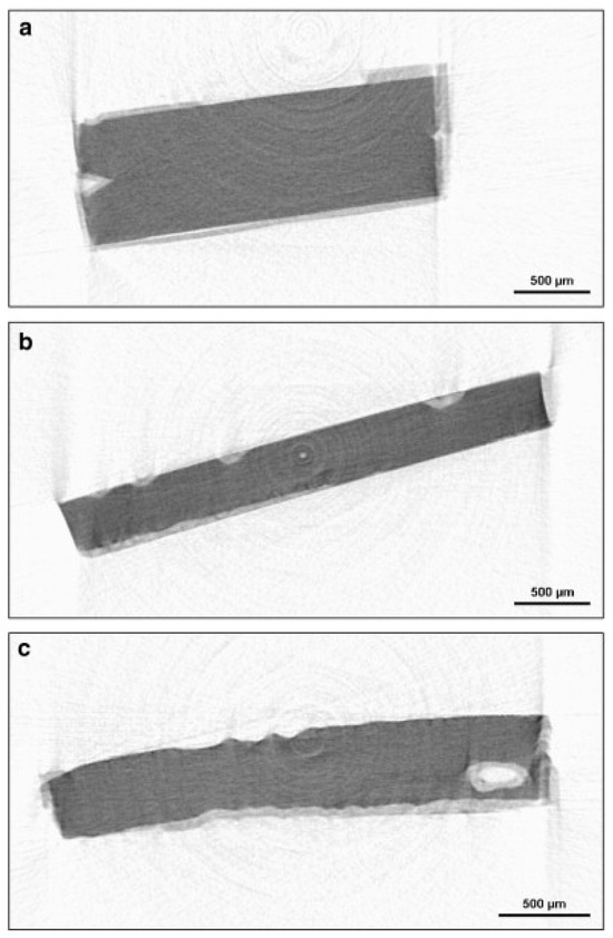 Menne et al. [20] examined pottery sherds from Neolithic megalithic tombs in Emsland, Germany, to characterise temper components and non-plastic inclusions. The CXT was able to detect various temper components and inclusions, namely bone, (imprints of) organic straw and biotite, as shown in Figure 4. In particular, while it was not clear whether features seen in thin micrograph sections were simply cavities or non-plastic inclusions, the 3D CXT showed that voids had the particular spatial extent and shape of straw material. Menne et al. also found that the porosity was higher for older samples, which may reflect a change in production technology to obtain denser pots [20]. However, it was not possible to distinguish different vessel types based upon the porosity values alone; otherwise, this would have allowed the identification of the vessel type based even upon a very small sherd fragment, which was otherwise typologically ambiguous.
