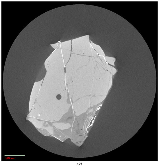 CXT has been used to examine the degree of corrosion in Bronze Age (dated to the late 15th and 14th centuries BCE) glass samples from Tel Brak in Syria, one containing cobalt to produce a blue colour (denoted BRAK 14) and another containing ferrous (iron) to produce a translucent brown colour (denoted BRAK 17) [35]. Examples of reconstructed 2D slice CXT images for these samples are given in Figure 16. The dark ovoid structures are bubbles in the glass. The brightness of the inclusions in the image of BRAK14 indicates a high atomic number and are calcium antimonate (Ca2Sb2O7) crystals. The lower X-ray absorbance surface corrosion-affected layer can clearly be seen extending almost all the way around the exterior of the chip of BRAK14, while it is a bit more localised in the chip of BRAK17. It has been suggested [35] that the extensive network of cracks throughout the whole of the bodies of the chips of the BRAK14 and BRAK17 glasses may be indicative of brittleness resulting from insufficient annealing during fabrication [39]. A combination of large heterogeneities and numerous bubbles is often indicative of low-quality workmanship and low-quality glass [39]. The glass in the adjoining zones surrounding some bubbles and the cracks within the BRAK14 and BRAK17 samples show less X-ray attenuation than the surrounding matrix. As mentioned above, this is probably due to the leaching of elements from the glass surface, especially sodium, probably by water ingress, from the burial environment along the cracks in the glass. The lack of durability this exemplifies was probably partly due to the relatively low levels of the network stabiliser, CaO, in the glasses from Tel Brak (3.9–5.8%), together with several other factors such as variable levels of humidity and temperature in the semi-desert burial environment in northern Syria.