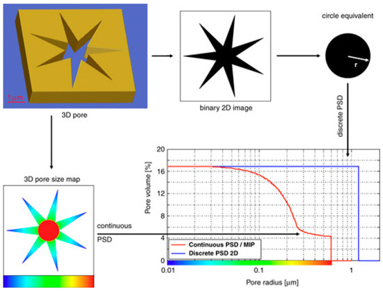 Illustration of the two different concepts of the “continuous pore size distribution (PSD)” and the “discrete PSD.” The star-like prism displayed to the upper left represents a model pore of rather simple geometry. In the case of 2D analysis, the radius of its coextensive circle is considered the only pore size yielded by the “discrete PSD.” In the case of the “continuous PSD” definition, the single pore object is resolved into its entire size spectrum. It is important to note that for a simplified pore structure without pore necks (such as the presented star-like prism), the “ink-bottle effect” disappears, and the results from the “continuous PSD” and from Mercury Intrusion Porosimetry give identical results. Reprinted with permission from Ref. [44]. 2008, John Wiley and Sons.