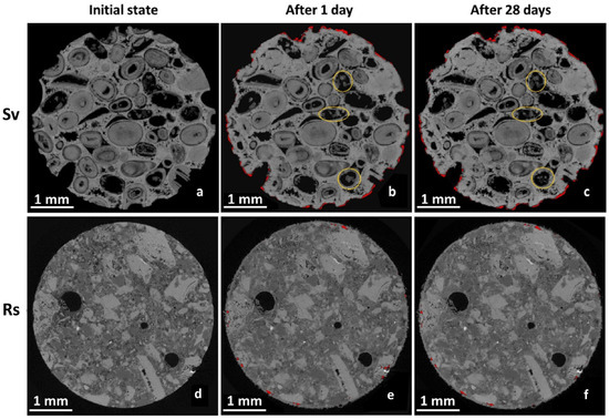 High-resolution CXT 2D slices, obtained with 5 μm resolution, at around 1 mm in depth of Savonnières limestone (Sv, above) and reconstituted stone (Rs, below) samples (above view) before (a,d), after one day (b,e), and after 28 days (c,f) of acid atmosphere weathering. Red areas represent the initial material that has disappeared, and the yellow circles highlight crystallisation inside ooids within the stone body. Reprinted with permission from Ref. [50]. 2018, Elsevier.
