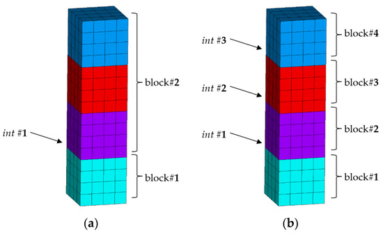 Two different FE models were constructed and utilized for the numerical analyses. The first FE model, depicted in Figure 3a, consists of two rigid blocks identified based on the present fracture observed in the bipedales layer. In order to facilitate comparison, a second model comprising of four rigid blocks of equal dimensions was also taken into account (see Figure 3b).
