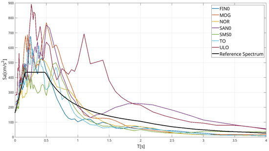 They were selected through Rexel [42] from the European Strong Motion Database and the ITACA Database to comply with the 5% damped elastic response spectrum, provided by the Italian Building Code NTC2018 for a return period of 975 years (Collapse prevention) in Ostia. Figure 4 shows the pseudo-acceleration spectra of the primary component of all the input ground notions used, together with the reference response spectrum. To perform the numerical analyses, for all the used seismic records, the horizontal component with the highest PGA value was always applied in the x-direction.