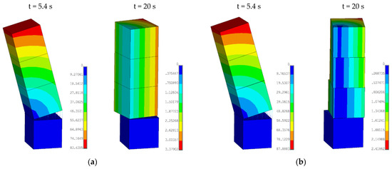 The time step t = 5.4 s corresponds to the step at which the maximum acceleration value is reached (in the seismic record FIN0); the instant t = 20 s corresponds to the end of the seismic event and reports the final configuration assumed by the pillar as a consequence of the seismic loading. What is illustrated in Figure 5, for the case of the seismic record FIN0, is quite general and occurs, though with different values, for all the other seismic records. Substantially, it is observed that the displacement configuration obtained at the end of the analyses shows a residual rotation of the upper part of the pillar with respect to the base (which is slightly different between the two-block and four-block model while still maintaining consistency over orders of magnitude of displacements and rotations).