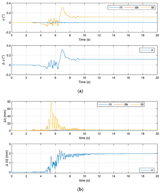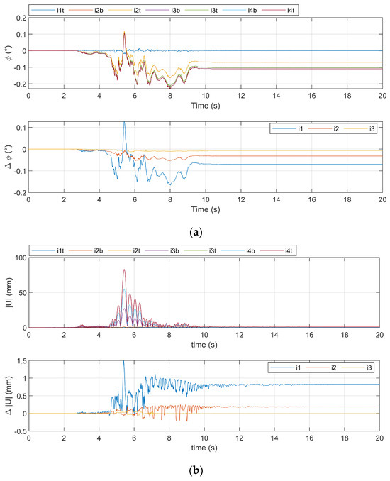 Going into details, denoting the interfaces between rigid blocks in the models with “i#”, numbered incrementally from the bottom to the top of the pillar (see Figure 3), any generalized displacement measured at the top of the lower block and at the bottom of the upper block will be referred to as “i#t” and “i#b” (where “#” denotes the number of the block with respect to the notation reported in Figure 3), respectively. With reference to this notation, Figure 6a shows the time histories of absolute (ϕ) and relative (Δϕ) rotations at each interface, while Figure 6b illustrates the time histories of the norm of the absolute () and relative () displacements at each interface. The term relative rotation (/displacement) refers to the difference (calculated at the interface between the blocks) between the rotation (/displacement) of the base of the upper block and the rotation (/displacement) of the top of the lower block.