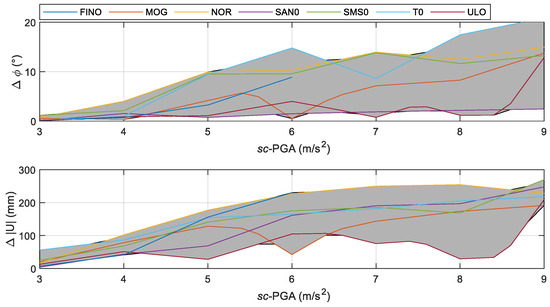 In Figure 8, the graph of such values as a function of the sc-PGA’s values is reported for all the sets of considered earthquakes (Table 1). The results provided by the two-block model are considered. Figure 8 summarizes the maximum value of the relative rotation () at the interface i1 for a sc-PGA, varying between 3 and 9 m/s2. In addition this figures also reports the maximum value of the absolute displacement () at the top of the FE model, i.e., the displacement of the level i2t.