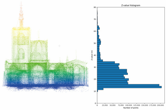 In the first stage, the point cloud is loaded from a file using NumPy to manage the data. The next step involves filtering these points based on specific height intervals in the Z-axis. This filtering aims to identify the height ranges where the highest concentration of points is found (Figure 2), which can reveal particular features of the analysed structure, such as floors. The hypothesis is that the Z-value where the most points are concentrated in a building corresponds to a flat surface, likely a floor.