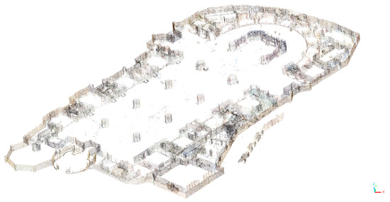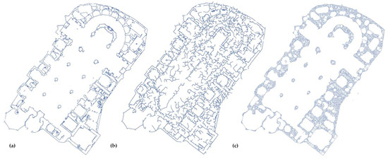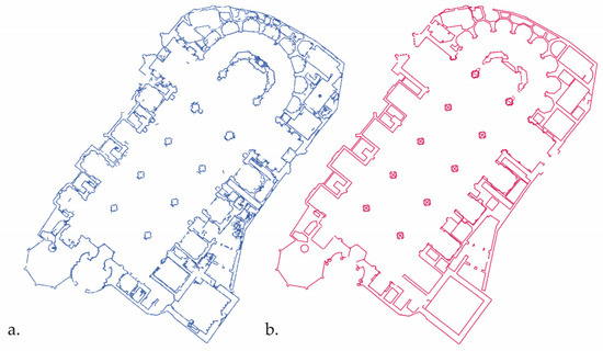 Furthermore, we experimented creating the 2D floor plan manually using CAD software. By importing a point cloud of the cathedral’s floor plan, we connected the points by hand to delineate the segments that define the building’s floor plan. This process took approximately 4.5 h for around 23,000 points, generating approximately 6400 segments. In contrast, the proposed method takes only about 50 s to produce the same segments.