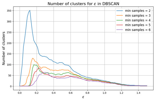 Experiments were conducted with the point cloud data from the floor plan of the Cathedral and the Chapel of the Holy Chalice, using a smaller sample of 1600 points. In these cases, the optimal epsilon value for generating the highest number of clusters was analysed based on varying min samples parameters, as shown in Figure 6 and Table 2.
